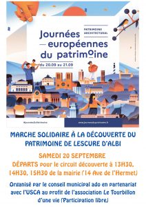Les jeunes du Conseil municipal ado organisent, en partenariat avec l’USCA, une marche solidaire à la découverte de notre patrimoine le samedi 20 septembre de 13h30 à 16h30.